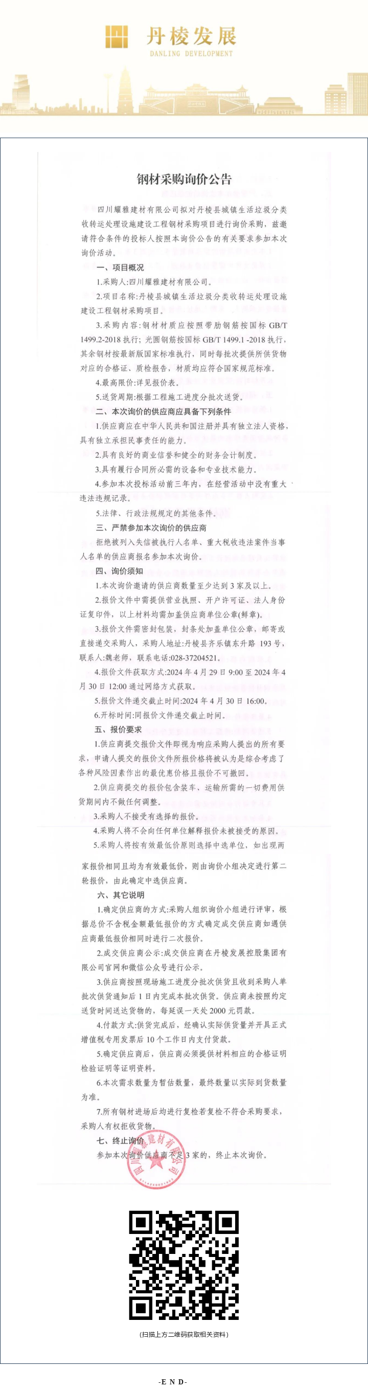 丹棱縣城鎮(zhèn)生活垃圾分類收轉(zhuǎn)運(yùn)處理設(shè)施建設(shè)工程鋼材采購項(xiàng)目詢價公告