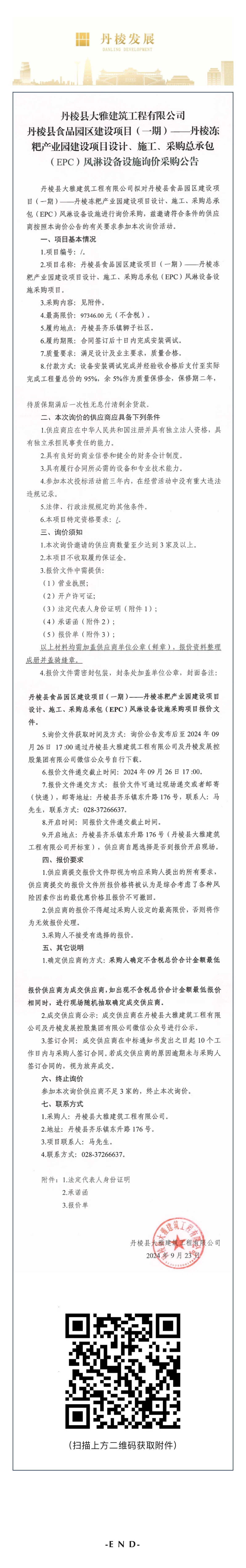 縣大雅建筑公司丹棱縣食品園區(qū)建設(shè)項(xiàng)目(一期)—丹棱凍粑產(chǎn)業(yè)園建設(shè)項(xiàng)目設(shè)計、施工、采購總承包(EPC)風(fēng)淋設(shè)備設(shè)施詢價采購公告