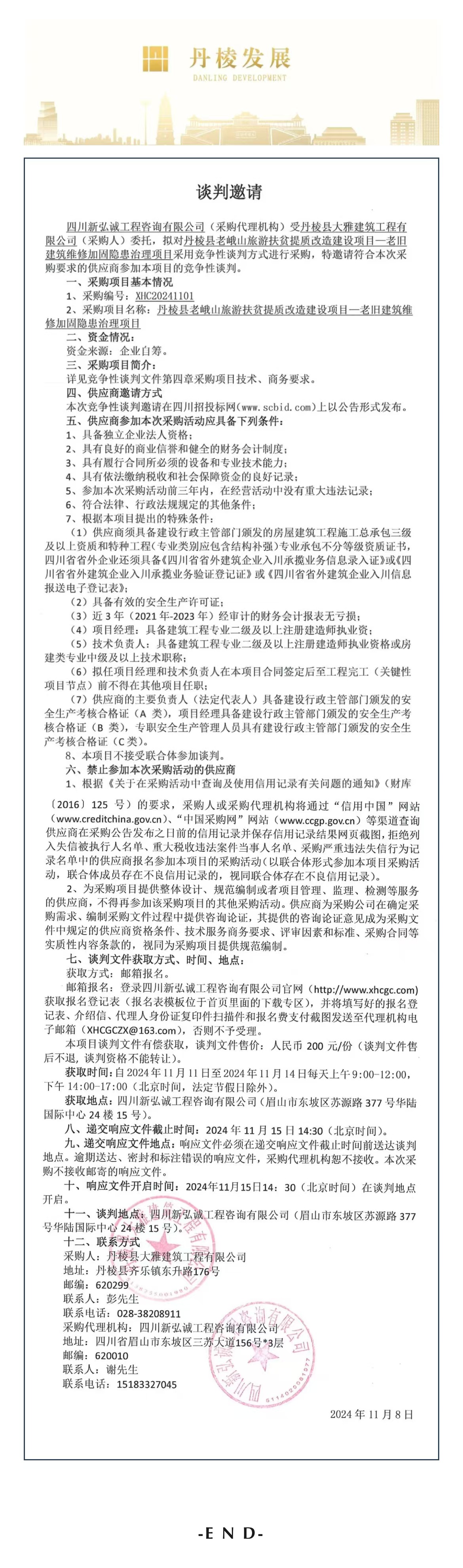 丹棱縣老峨山旅游扶貧提質(zhì)改造建設(shè)項(xiàng)目——老舊建筑維修加固隱患治理項(xiàng)目談判邀請公告