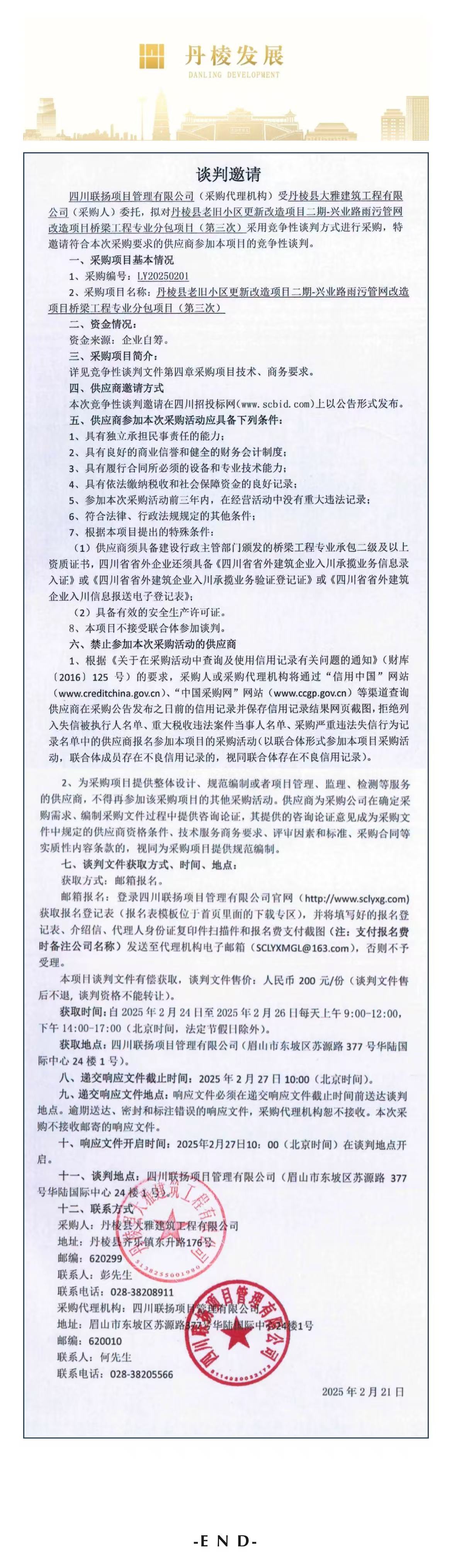 丹棱縣老舊小區(qū)更新改造項(xiàng)目二期-興業(yè)路雨污管網(wǎng)改造項(xiàng)目橋梁工程專業(yè)分包項(xiàng)目談判邀請公告(第三次)