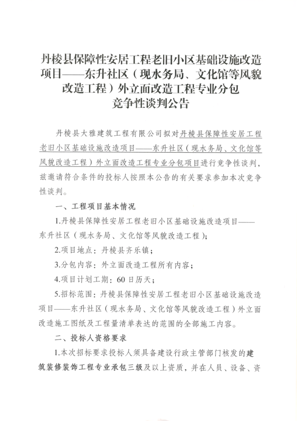 【大雅建筑公司】丹棱縣保障性安居工程老舊小區(qū)基礎設施改造項目--東升社區(qū)(現(xiàn)水務局、文化館等風貌改造工程)外立面改造工程專業(yè)分包競爭性談判公告