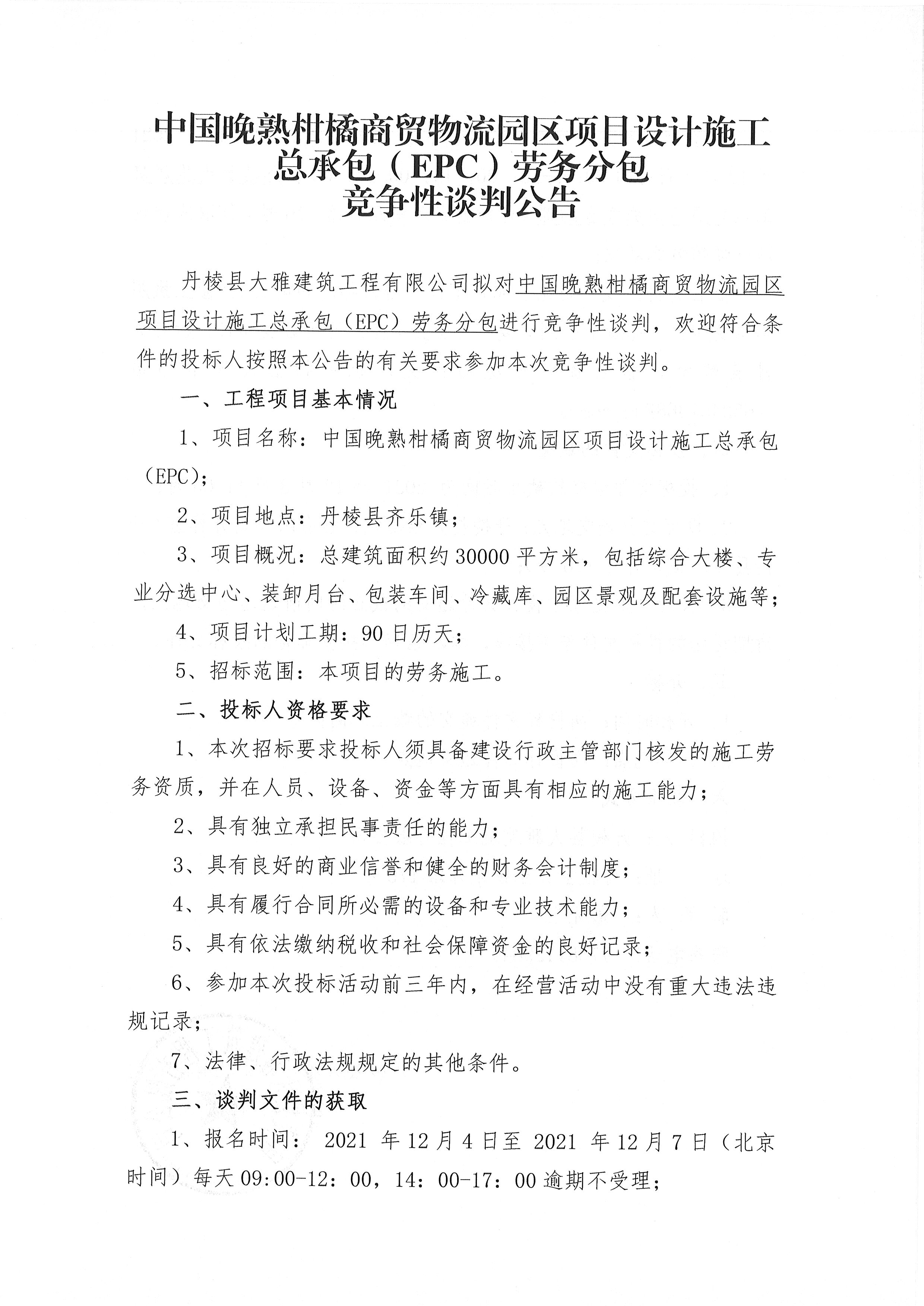 【大雅建筑公司】中國晚熟柑橘商貿(mào)物流園區(qū)項目設計施工總承包(EPC)勞務分包競爭性談判公告