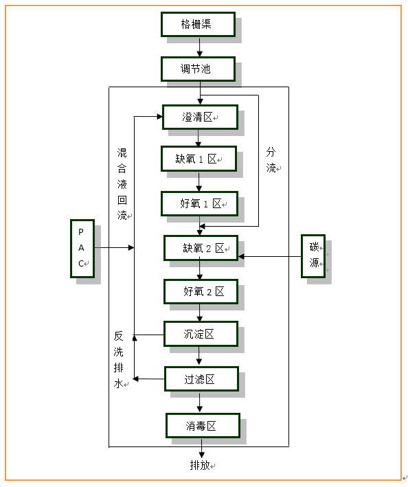 污水首先通過格柵去除漂浮物等較大垃圾,減少污水中頭發(fā)絲、絨狀絮體等細小漂浮物進入后端生化處理系統(tǒng)。格柵渠設(shè)置在調(diào)節(jié)池內(nèi)。通過格柵攔截污水中的纖維狀及較大的顆粒狀雜質(zhì)。調(diào)節(jié)用以均衡水量、水質(zhì),內(nèi)置潛污泵及回流措施,以保證一定的額定流量提升至污水處理設(shè)備。
