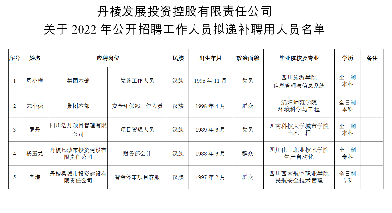 附件:丹棱發(fā)展投資控股有限責(zé)任公司關(guān)于2022年公開招聘工作人員擬遞補(bǔ)聘用人員名單