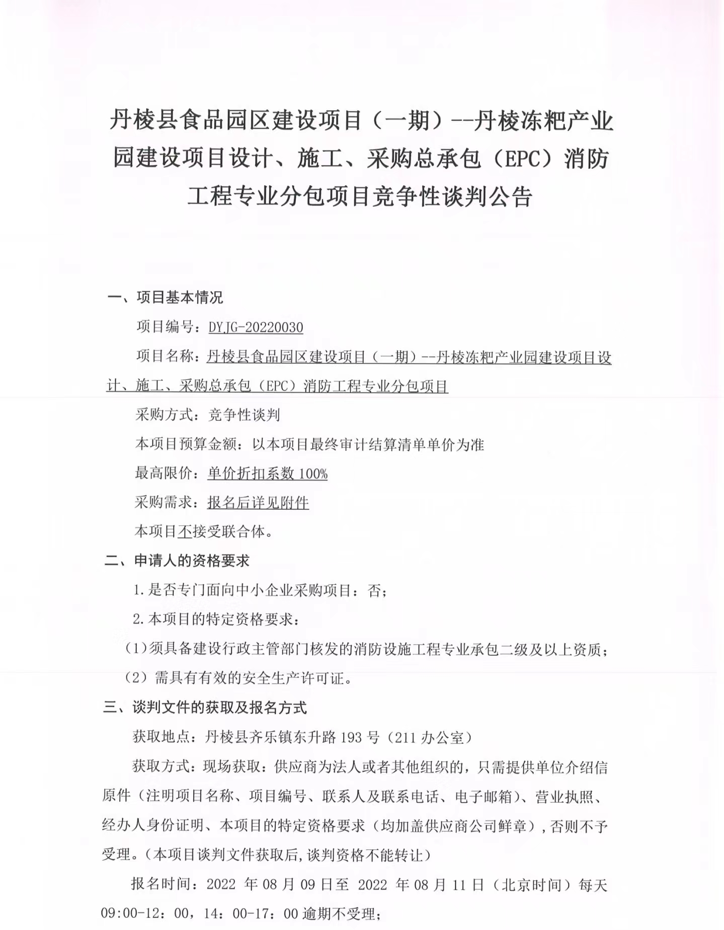 丹棱縣食品園區(qū)建設(shè)項(xiàng)目(一期)--丹棱凍粑產(chǎn)業(yè)園建設(shè)項(xiàng)目設(shè)計(jì)、施工、采購總承包(EPC)消防工程專業(yè)分包項(xiàng)目競爭性談判公告