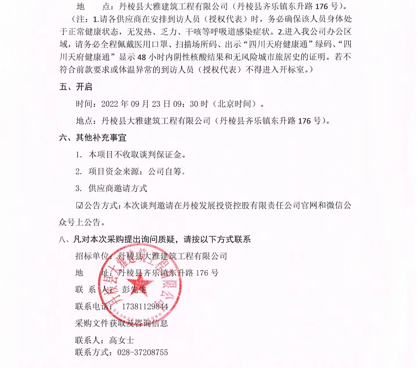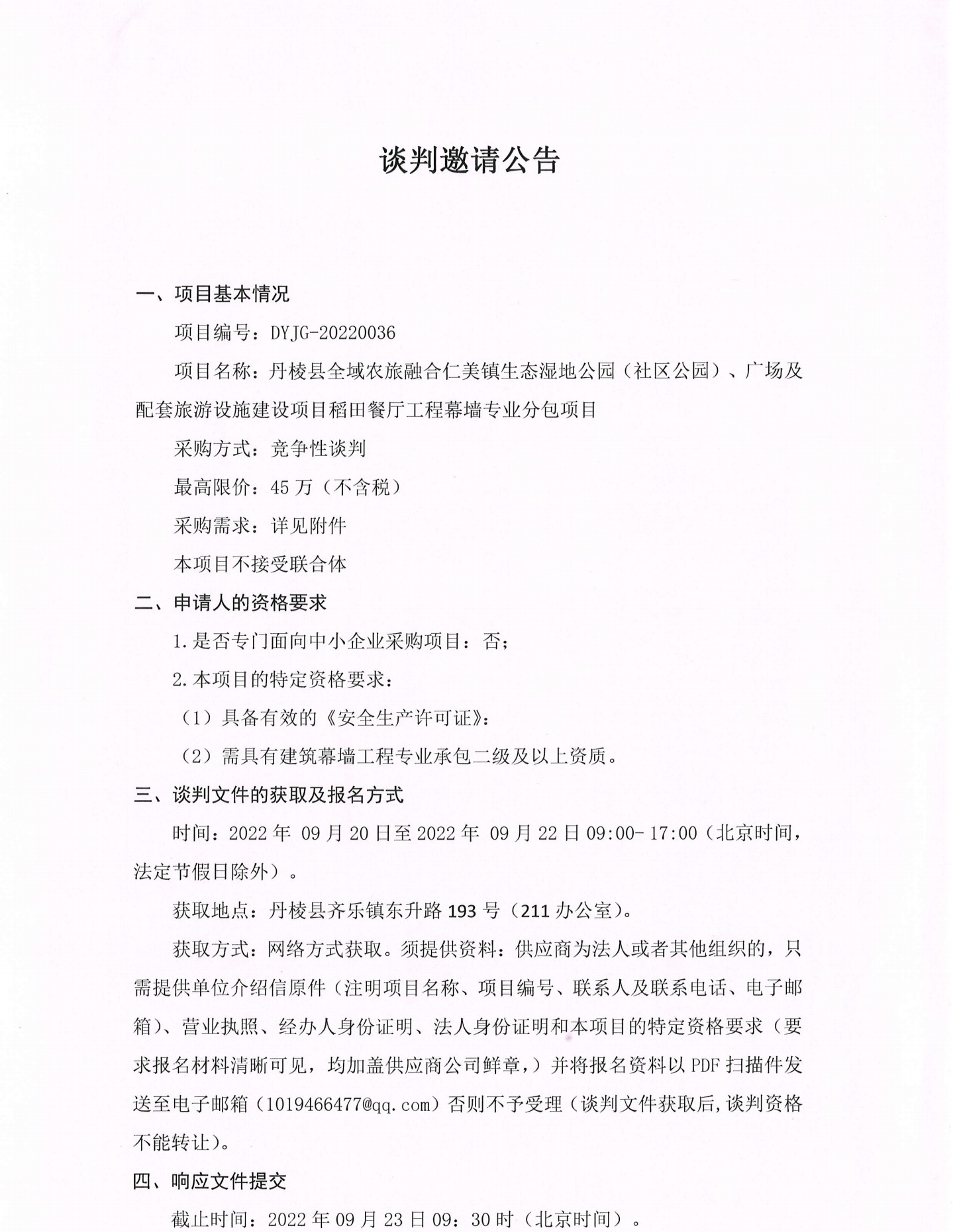 丹棱縣全域農旅融合仁美鎮(zhèn)生態(tài)濕地公園(社區(qū)公園)、廣場及配套旅游設施建設項目稻田餐廳工程幕墻專業(yè)分包項目談判邀請公告