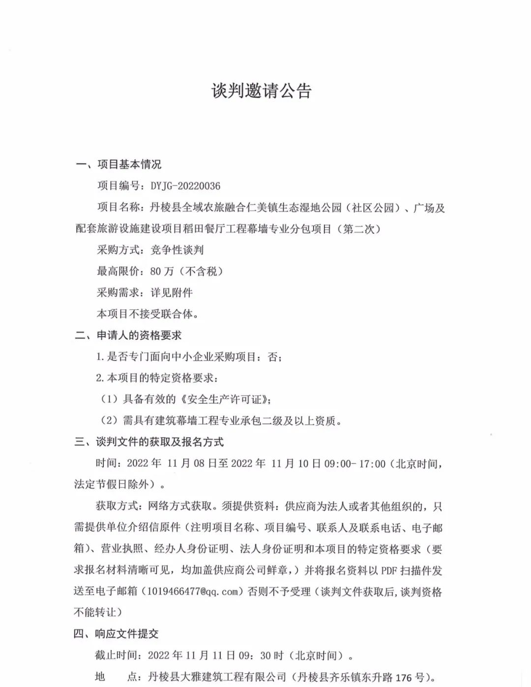 丹棱縣全域農(nóng)旅融合仁美鎮(zhèn)生態(tài)濕地公園(社區(qū)公園)、廣場及配套旅游設施建設項目稻田餐廳工程幕墻專業(yè)分包項目(第二次)談判邀請公告