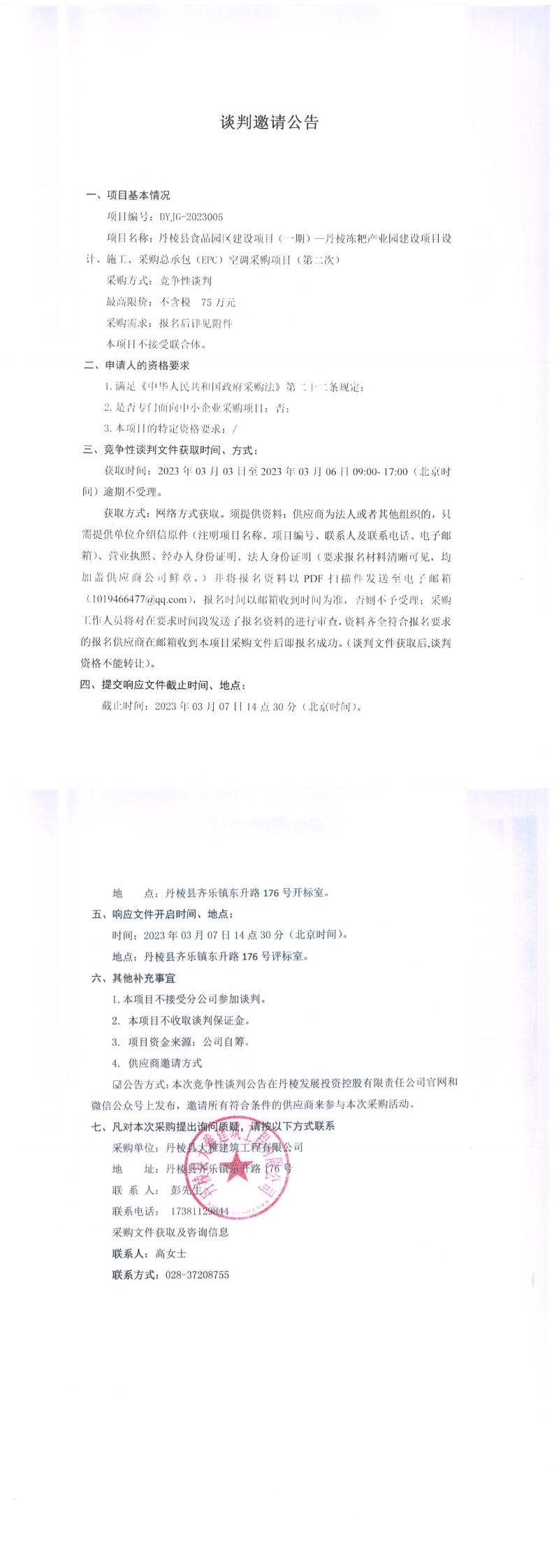 丹棱縣食品園區(qū)建設(shè)項(xiàng)目(一期)--丹棱凍粑產(chǎn)業(yè)園建設(shè)項(xiàng)目設(shè)計(jì)、施工、采購總承包(EPC)空調(diào)采購項(xiàng)目(第二次)談判邀請公告