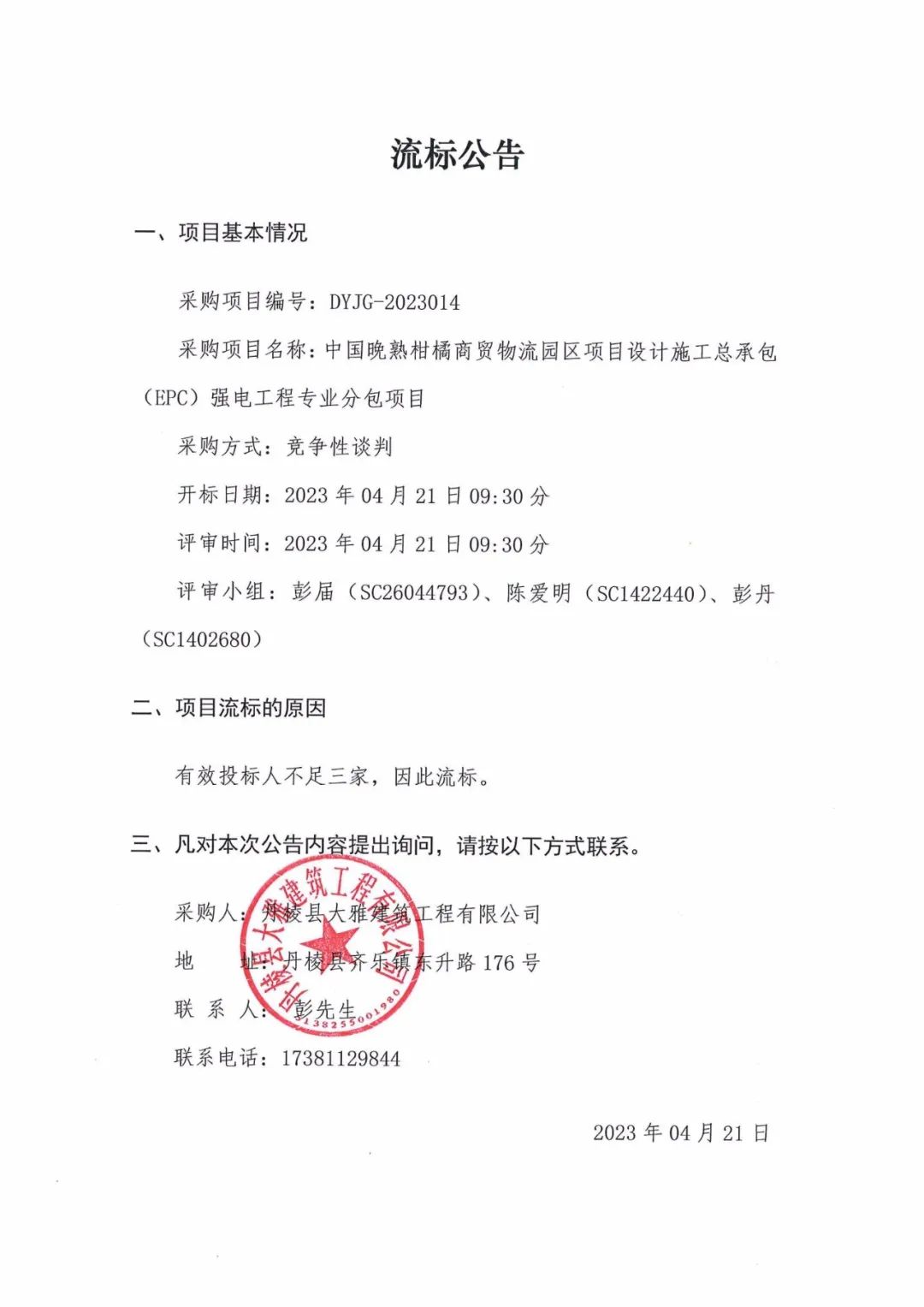 中國(guó)晚熟柑橘商貿(mào)物流園區(qū)項(xiàng)目設(shè)計(jì)施工總承包(EPC)強(qiáng)電工程專(zhuān)業(yè)分包項(xiàng)目流標(biāo)公告