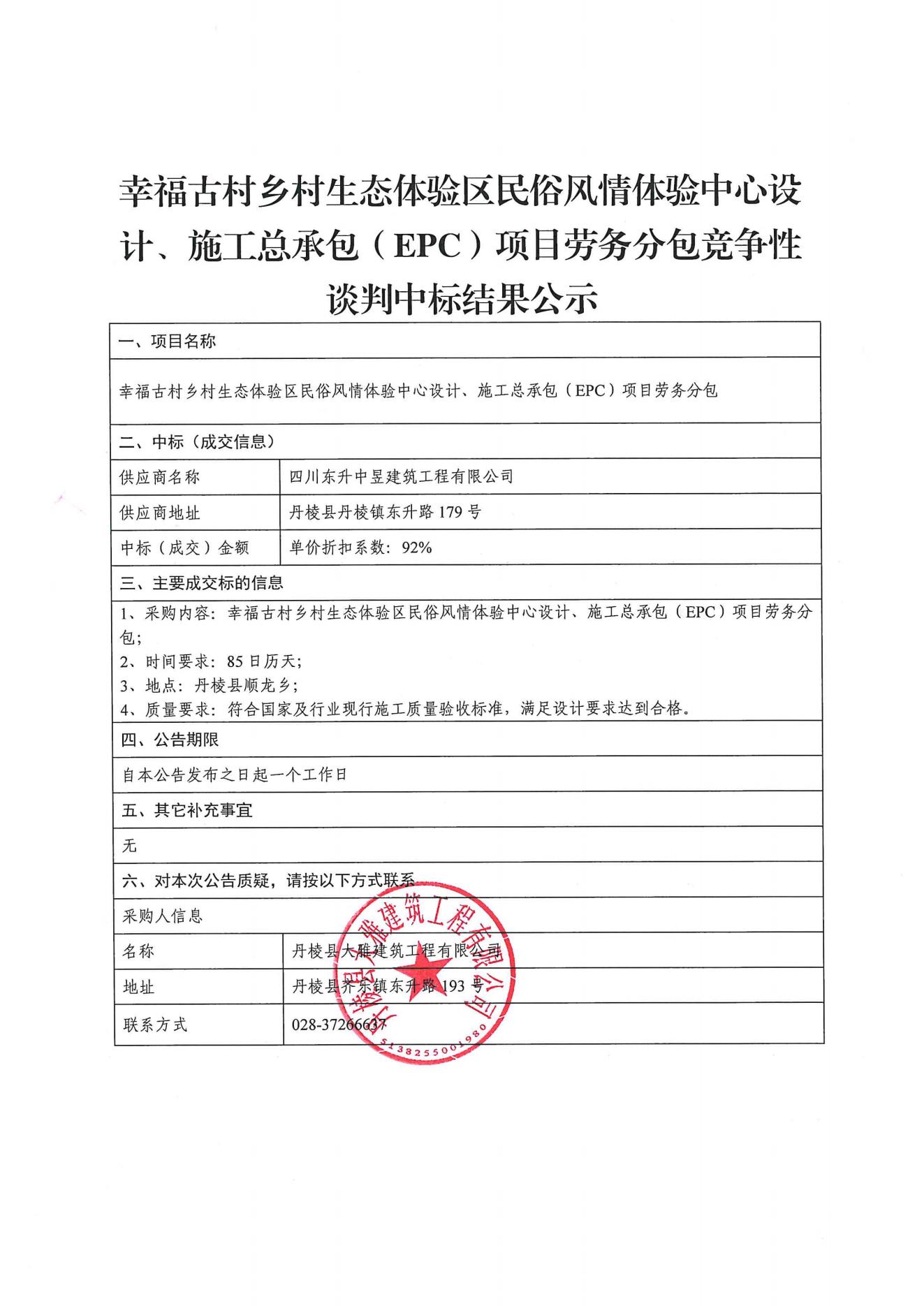 【大雅建筑公司】幸福古村鄉(xiāng)村生態(tài)體驗區(qū)民俗風情體驗中心設計、施工總承包(EPC)項目勞務分包競爭性談判中標結果公示