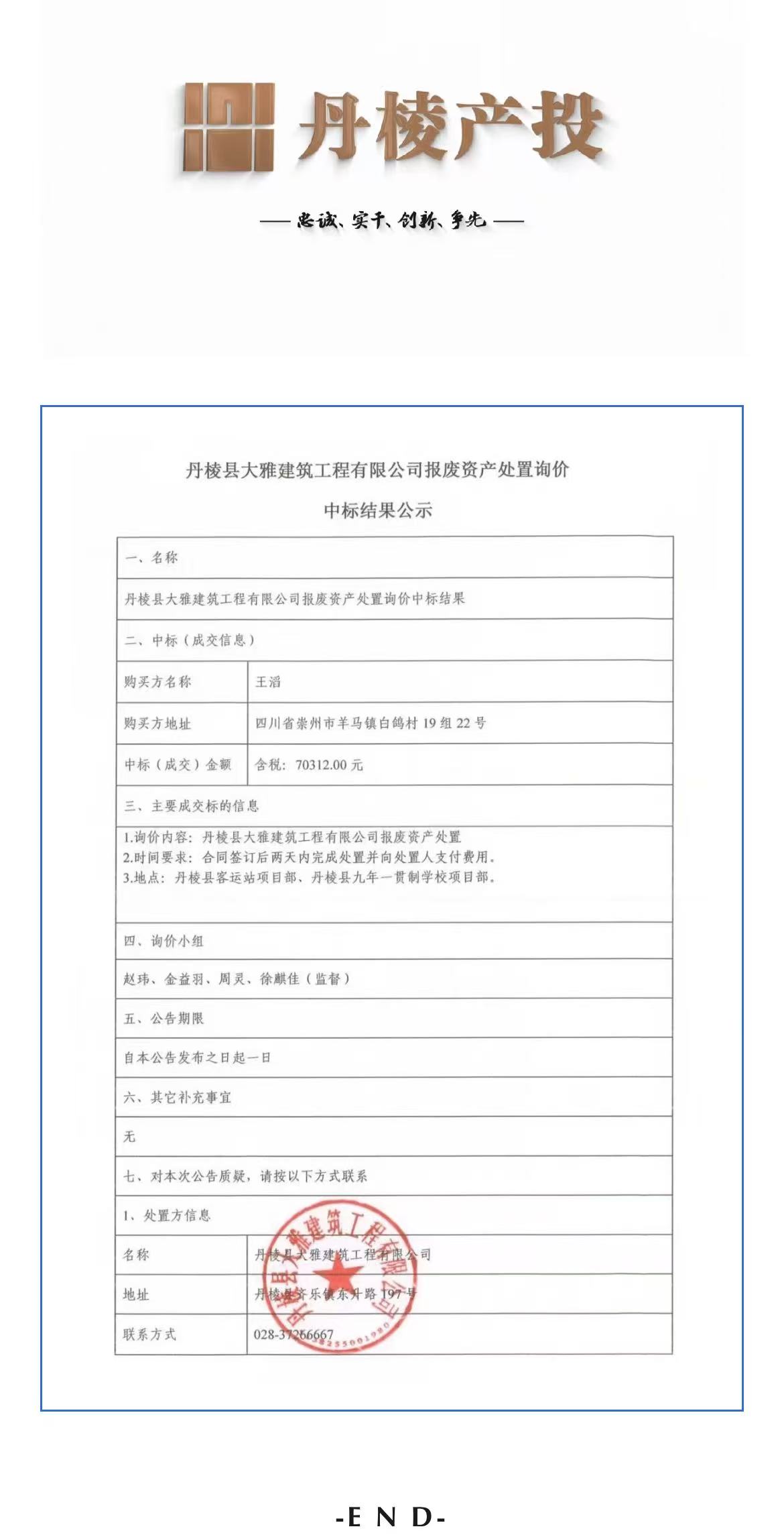 丹棱縣大雅建筑工程有限公司報廢資產(chǎn)處置詢價中標(biāo)結(jié)果公示