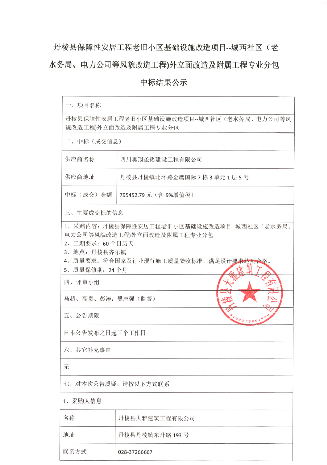 【大雅建筑公司】丹棱縣保障性安居工程老舊小區(qū)基礎設施改造項目--城西社區(qū)(老水務局、電力公司等風貌改造工程)外立面改造及附屬工程專業(yè)分包中標結果公示