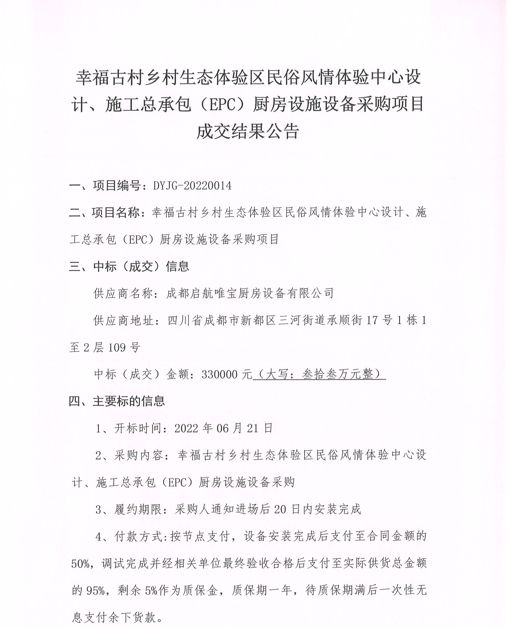 幸福古村鄉(xiāng)村生態(tài)體驗(yàn)區(qū)民俗風(fēng)情體驗(yàn)中心設(shè)計(jì)、施工總承包(EPC)廚房設(shè)施設(shè)備采購(gòu)項(xiàng)目成交結(jié)果公告