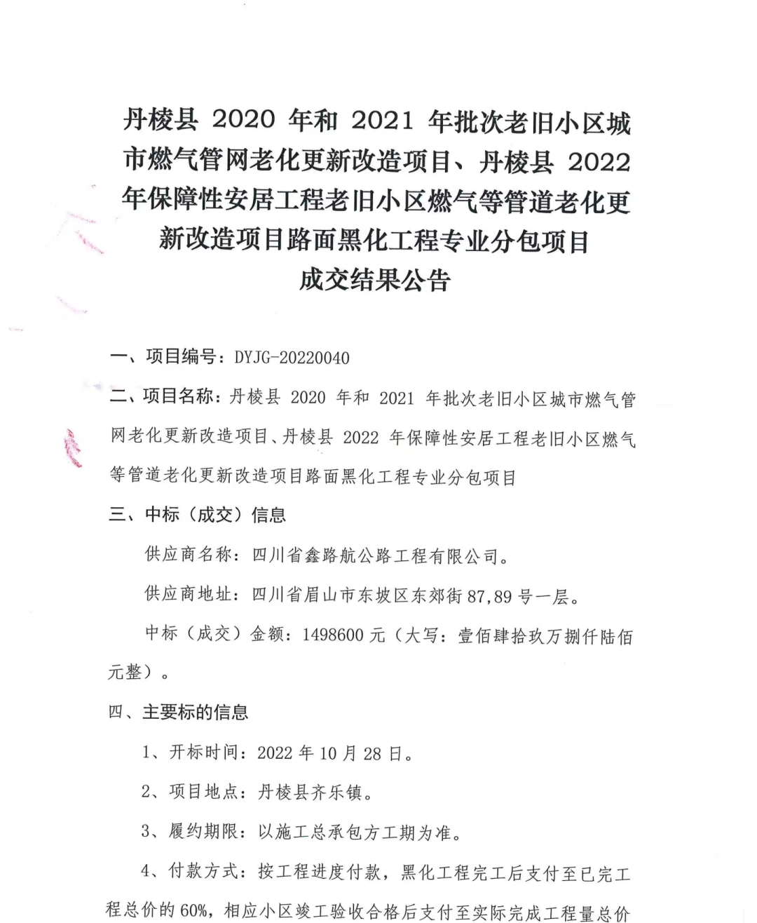 丹棱縣2020年、2021年、2022年保障性安居工程老舊小區(qū)燃?xì)獾裙艿览匣赂脑祉椖柯访婧诨こ虒I(yè)分包項目成交結(jié)果公告
