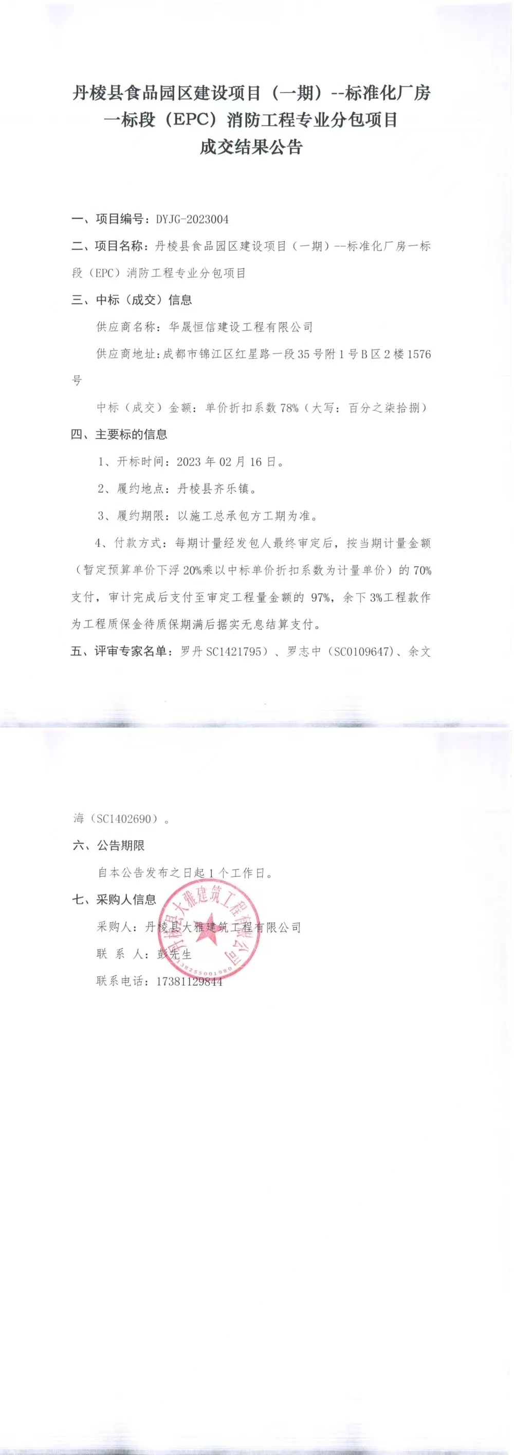 丹棱縣食品園區(qū)建設(shè)項(xiàng)目(一期)--標(biāo)準(zhǔn)化廠房一標(biāo)段(EPC)消防工程專(zhuān)業(yè)分包項(xiàng)目成交結(jié)果公告