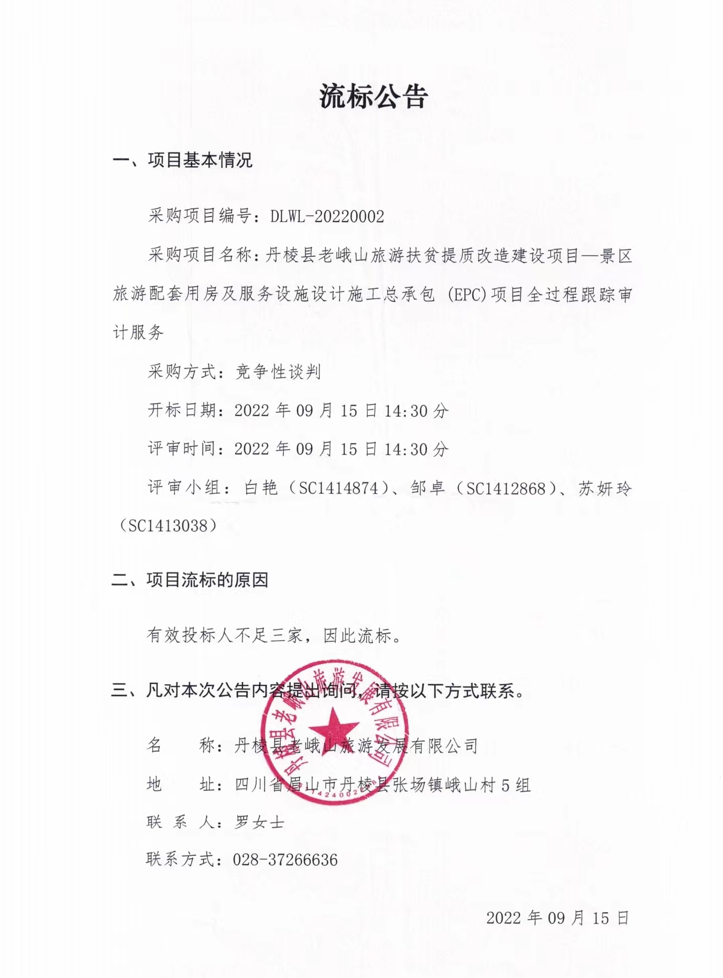 丹棱縣老峨山旅游扶貧提質(zhì)改造建設(shè)項目--景區(qū)旅游配套用房及服務(wù)設(shè)施設(shè)計施工總承包(EPC)項目全過程跟蹤審計服務(wù)流標(biāo)公告