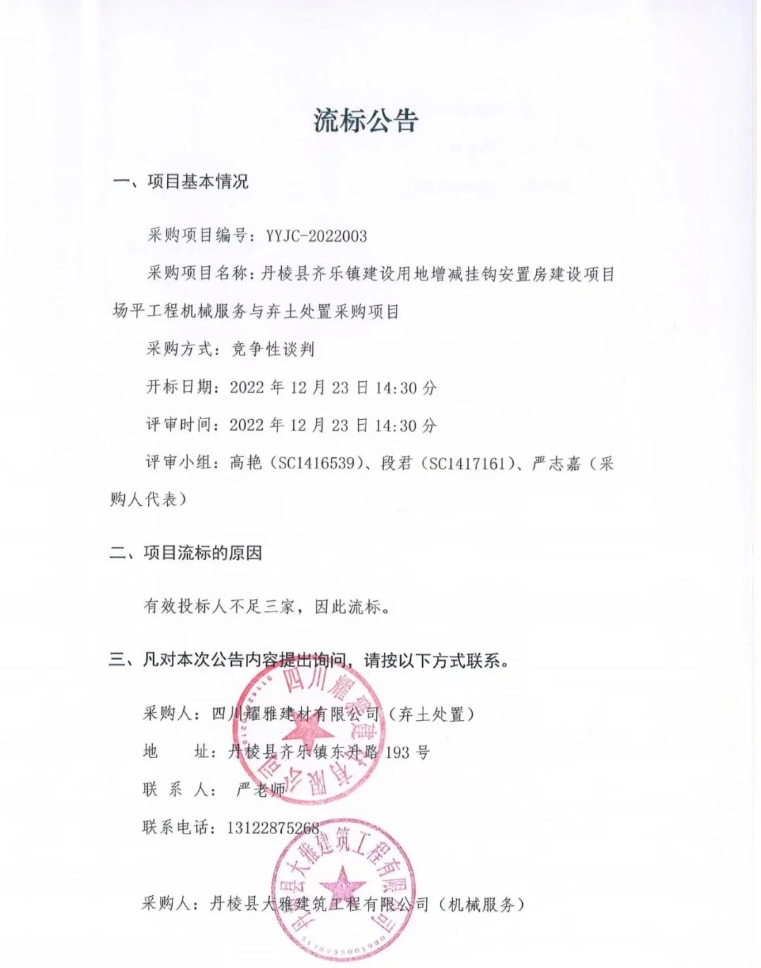 丹棱縣齊樂鎮(zhèn)建設(shè)用地增減掛鉤安置房建設(shè)項目場平工程機械服務(wù)與棄土處置采購項目流標(biāo)公告