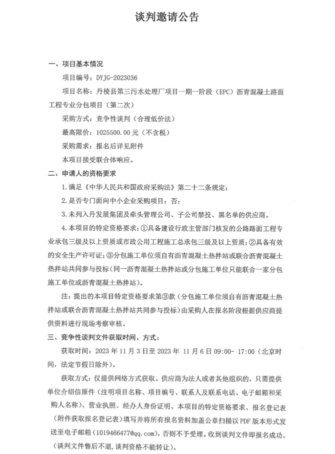 丹棱縣第三污水處理廠項(xiàng)目一期一階段(EPC)瀝青混凝土路面工程專業(yè)分包項(xiàng)目(第二次)談判邀請公告