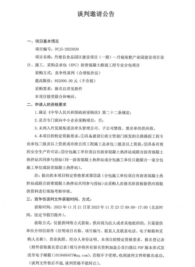 丹棱縣食品園區(qū)建設項目(一期)—丹棱凍粑產(chǎn)業(yè)園建設項目設計、施工、采購總承包(EPC)瀝青混凝土路面工程專業(yè)分包項目談判邀請公告