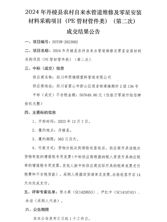 2024年丹棱縣農(nóng)村自來水管道維修及零星安裝材料采購項目(PE管材管件類)(第二次)成交結果公告