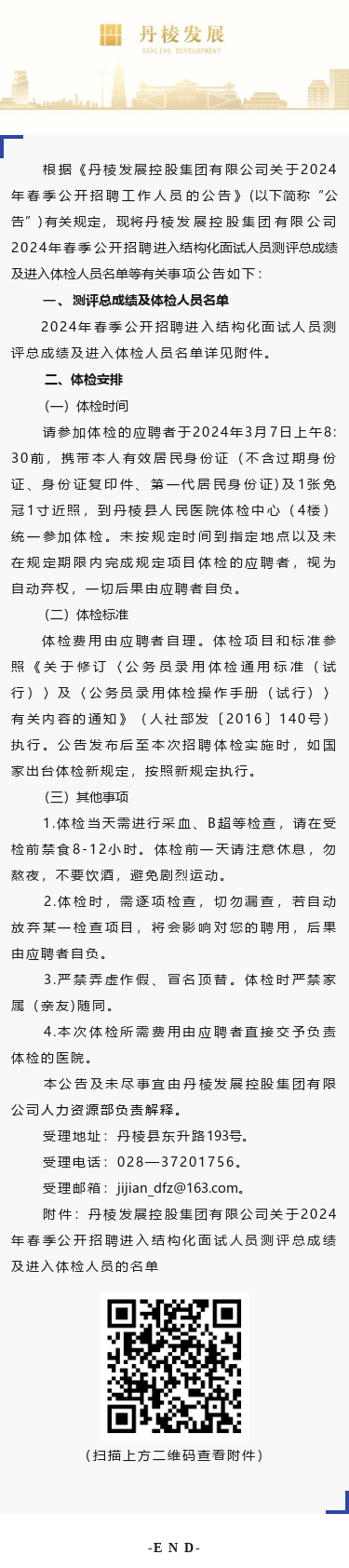 丹棱發(fā)展控股集團(tuán)有限公司關(guān)于2024年春季公開招聘進(jìn)入結(jié)構(gòu)化面試人員測評(píng)總成績及進(jìn)入體檢人員的公告