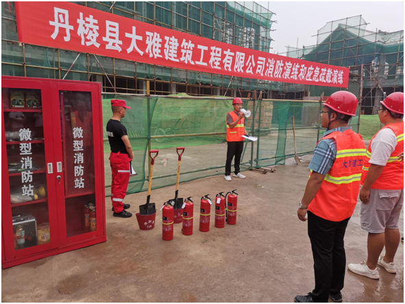 為進(jìn)一步提高丹棱縣大雅建筑工程有限公司(以下簡稱“縣大雅建筑公司”)全體工作人員消防安全意識和應(yīng)急處置能力,6月24日,我司在仁美鎮(zhèn)雙橋社區(qū)農(nóng)副產(chǎn)品交易中心項目(以下簡稱“雙橋項目”)施工現(xiàn)場組織開展了一場消防應(yīng)急演練,此次演練邀請到丹棱發(fā)展投資控股有限責(zé)任公司相關(guān)領(lǐng)導(dǎo)和部室人員觀摩指導(dǎo)。
