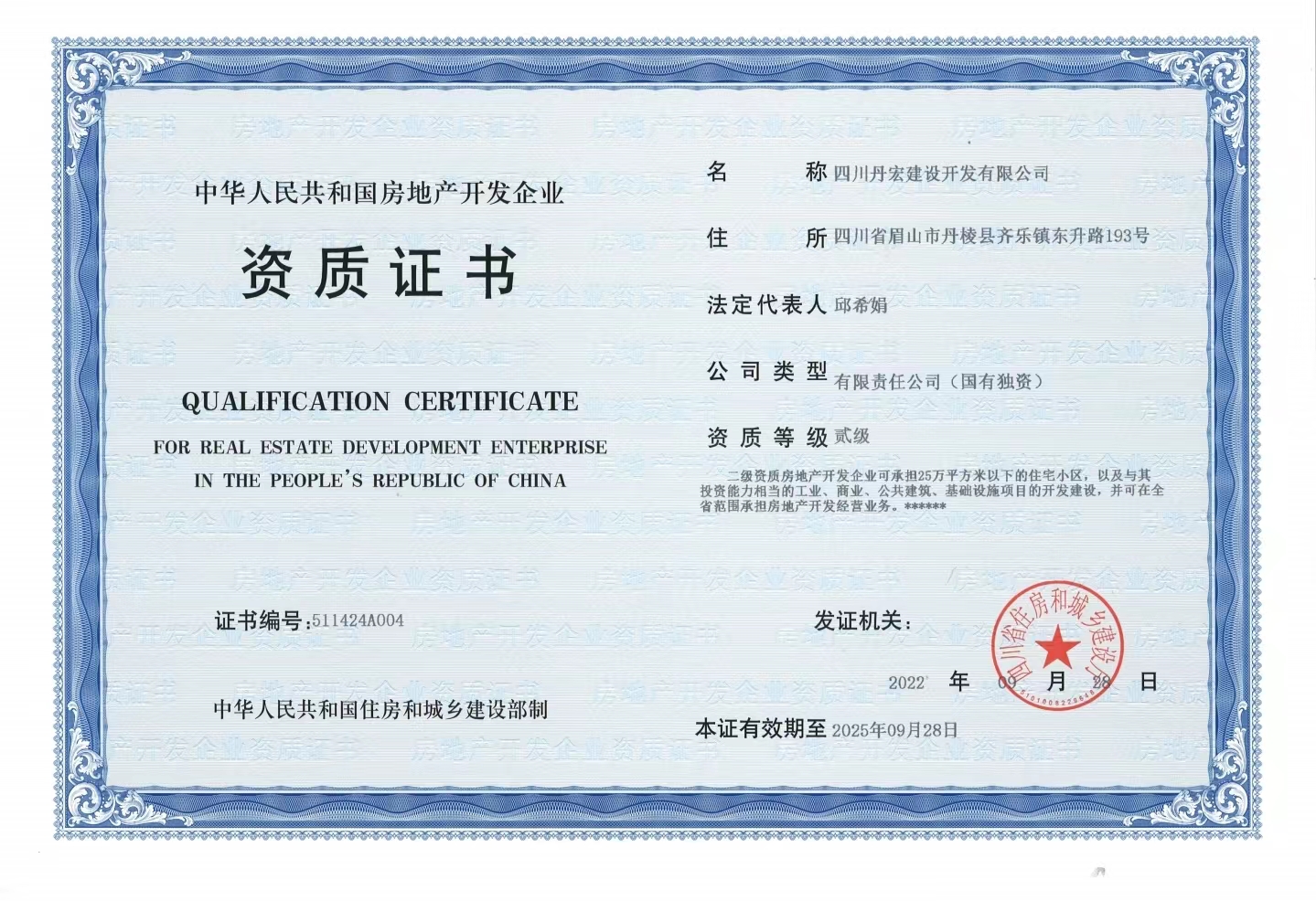 近日,丹發(fā)展集團(tuán)下屬的四川丹宏建設(shè)開發(fā)有限公司順利通過了四川省住房和城鄉(xiāng)建設(shè)廳資格審核,成功獲取了房地產(chǎn)開發(fā)二級資質(zhì)。標(biāo)志著丹宏公司可承擔(dān)建筑面積25萬平方米以下項目的開發(fā)建設(shè),并可在全省范圍承擔(dān)房地產(chǎn)開發(fā)經(jīng)營業(yè)務(wù),為進(jìn)一步擴(kuò)大建設(shè)規(guī)模及開發(fā)區(qū)域奠定了堅實基礎(chǔ)。