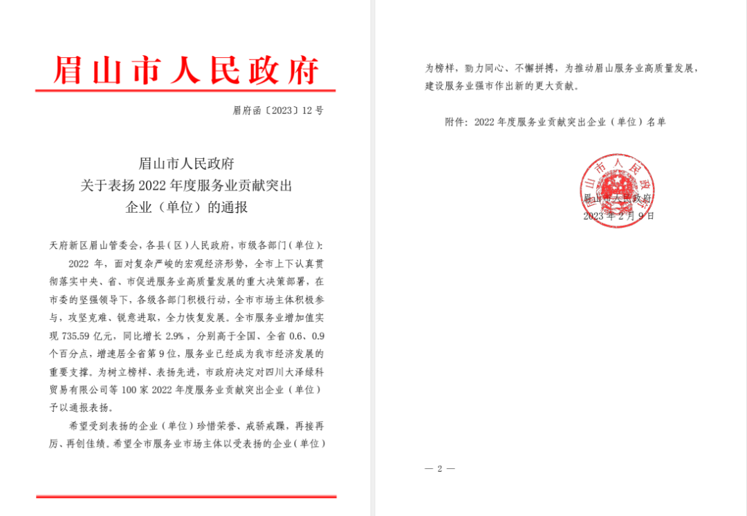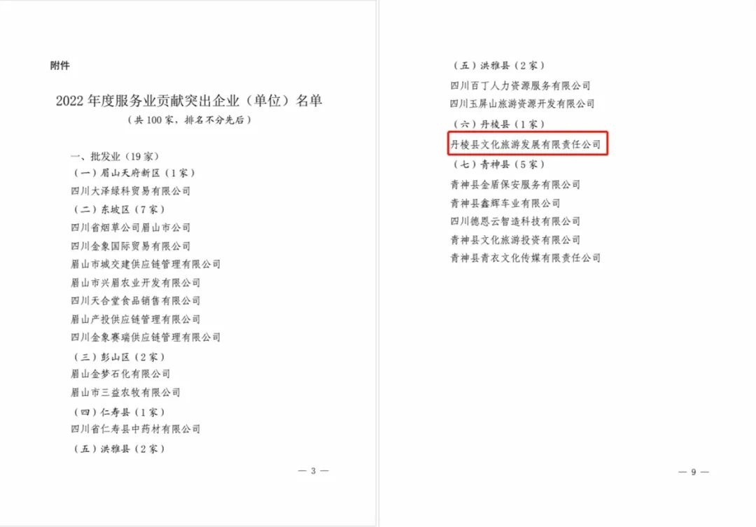 點(diǎn)贊!丹棱縣文化旅游發(fā)展有限責(zé)任公司榮獲眉山市2022年度服務(wù)業(yè)貢獻(xiàn)突出企業(yè)榮譽(yù)稱號(hào)